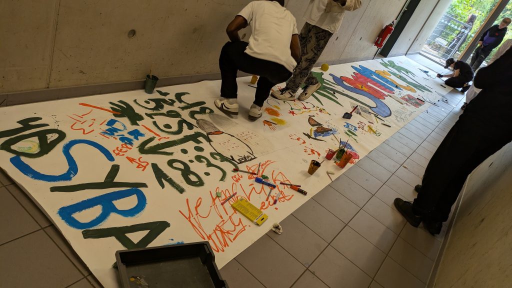 Ein besonderes Highlight war wie jedes Jahr das große Gemeinschaftsbild der Otto-Seeling-Schule, das von Schülern, Lehrkräften und Eltern gemeinsam gestaltet wurde. Auch der Regen konnte der Stimmung keinen Abbruch tun: Auf dem Pausenhof fanden sich immer wieder fußballbegeisterte Gruppen zusammen, um zu spielen. Für Kletterfreunde war die mobile Kletterwand der Kletterhalle Bambule ein echter Anziehungspunkt.
